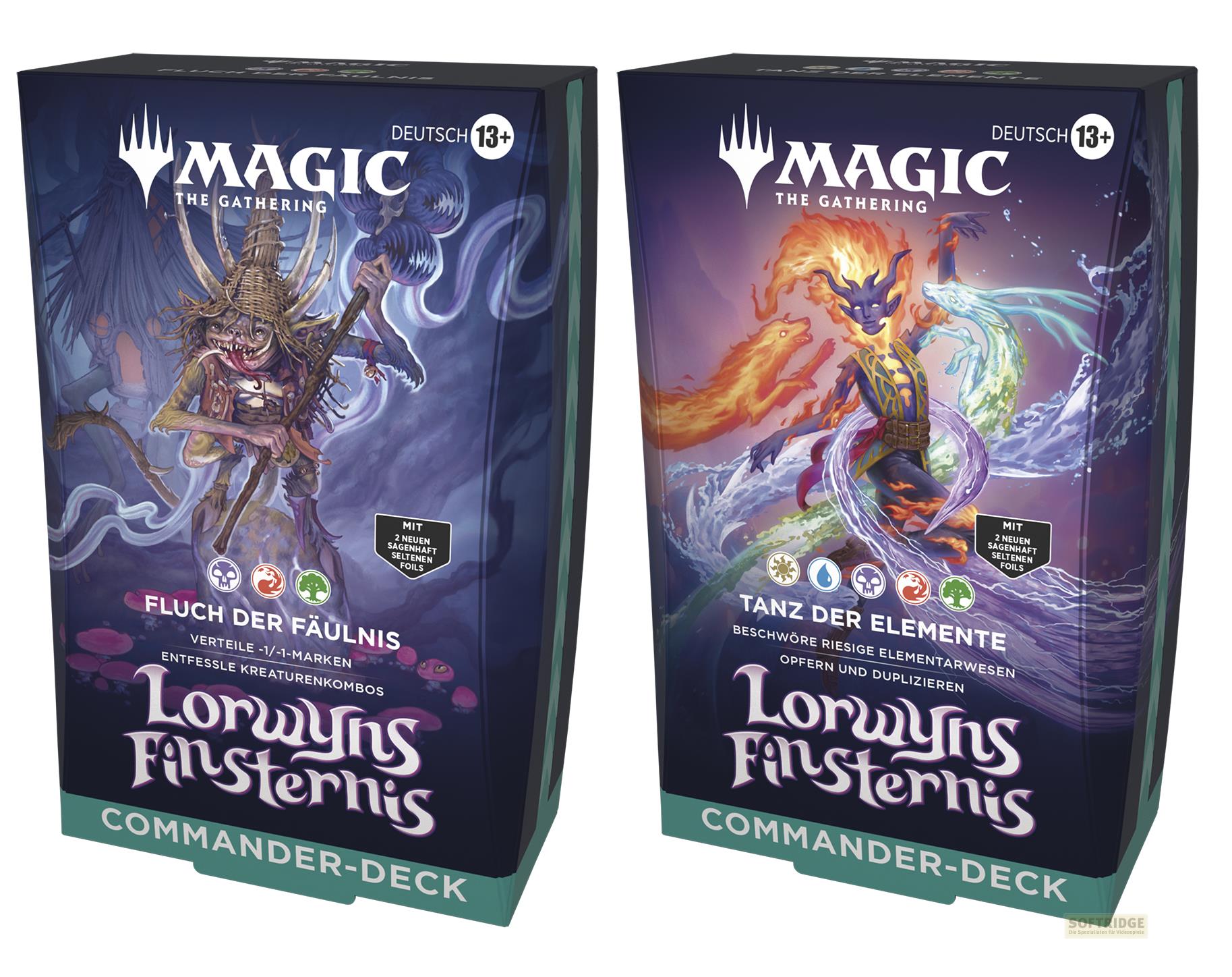 Commander-Decks sind direkt aus der Packung spielfertig und enthalten alles, was du brauchst, um das beliebteste Multiplayer-Format von Magic zu spielen. In Lorwyns Finsternis gibt es zwei verschiedene Commander-Decks.